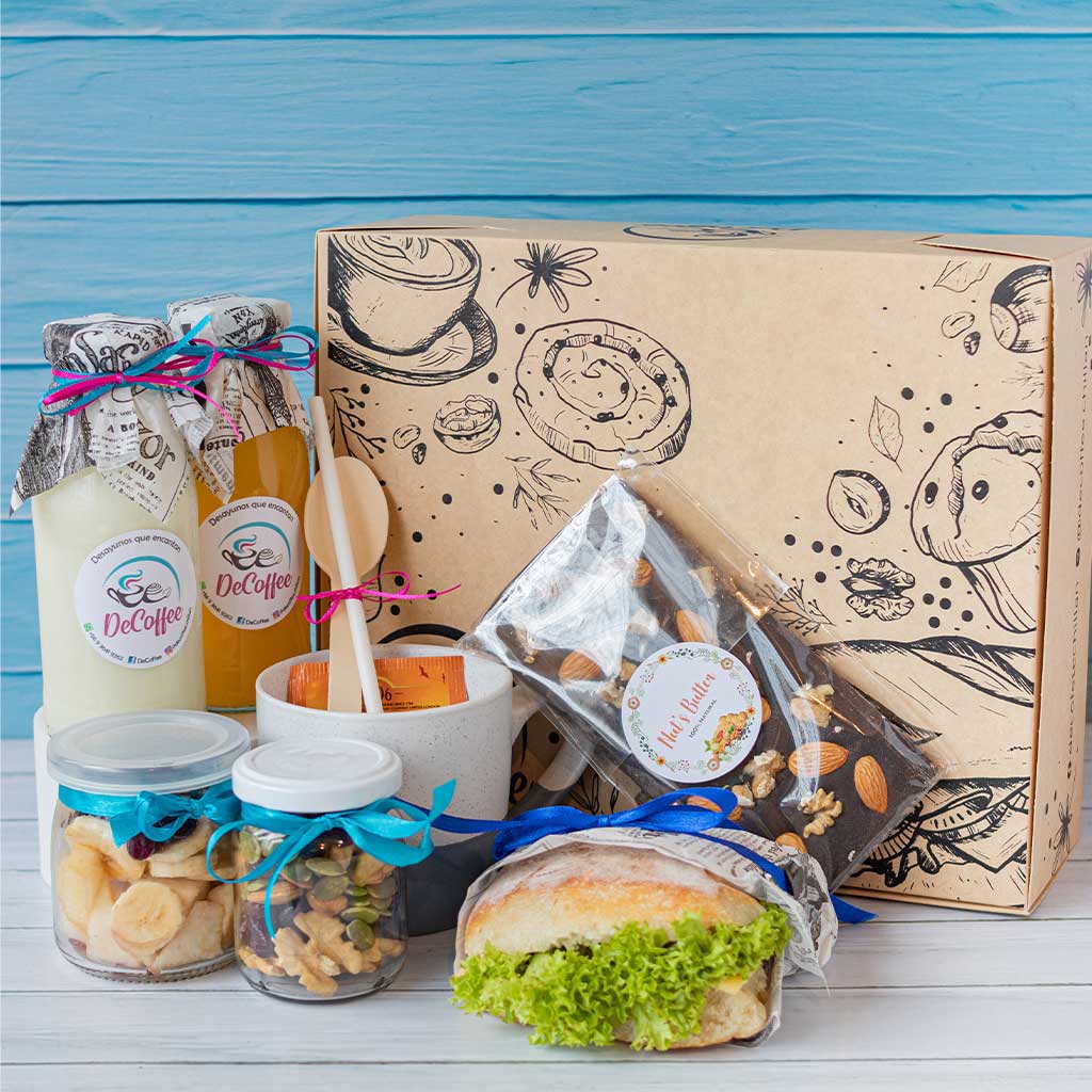 El desayuno se entrega en una caja de papel kraft con una tarjeta personalizada. Foto de referencia