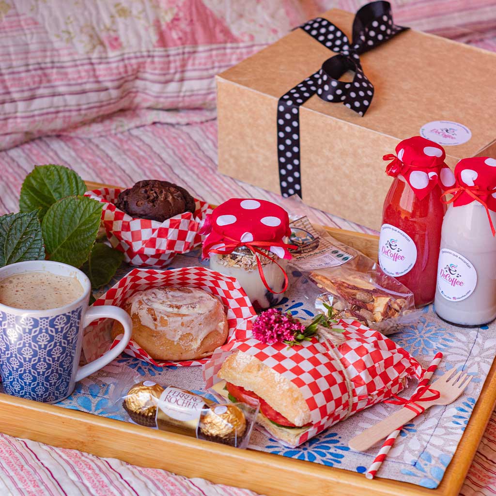 El desayuno se entrega en una caja de papel kraft con una tarjeta personalizada